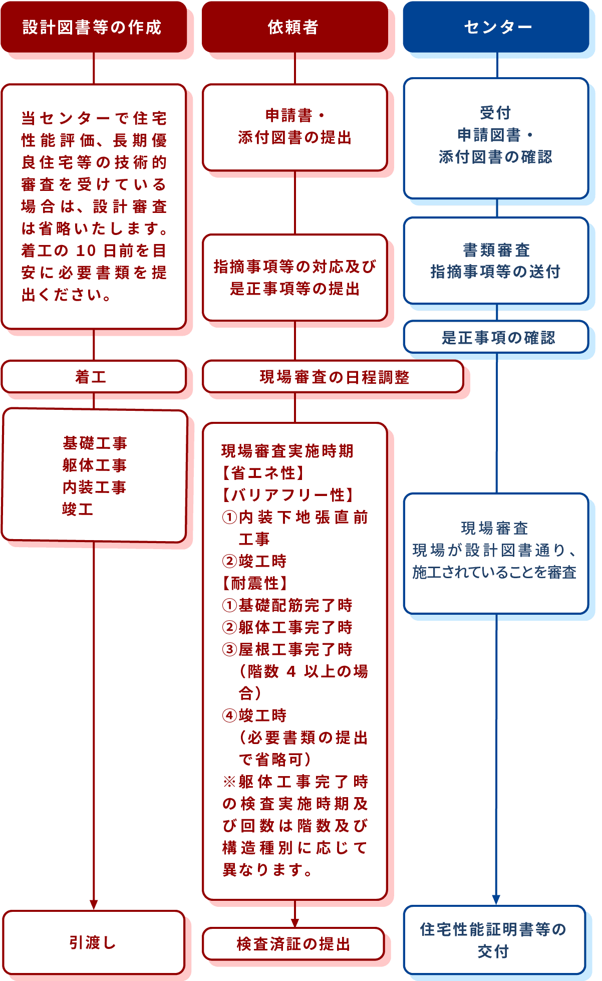 既に工事が進捗している物件について、設計段階で必要な性能が確保できていない可能性があります。依頼する前に必要な性能が確保されていることを必ず確認して下さい。また、既に工事の進捗状況により、所定の建設段階の確認ができない場合物件については、施工写真等の施工記録の確認により実施することになります。これらの施工記録等により設計図書どおりに施工されていることが確認できない場合については、住宅性能証明書を発行できない場合がありますのでご了承ください。